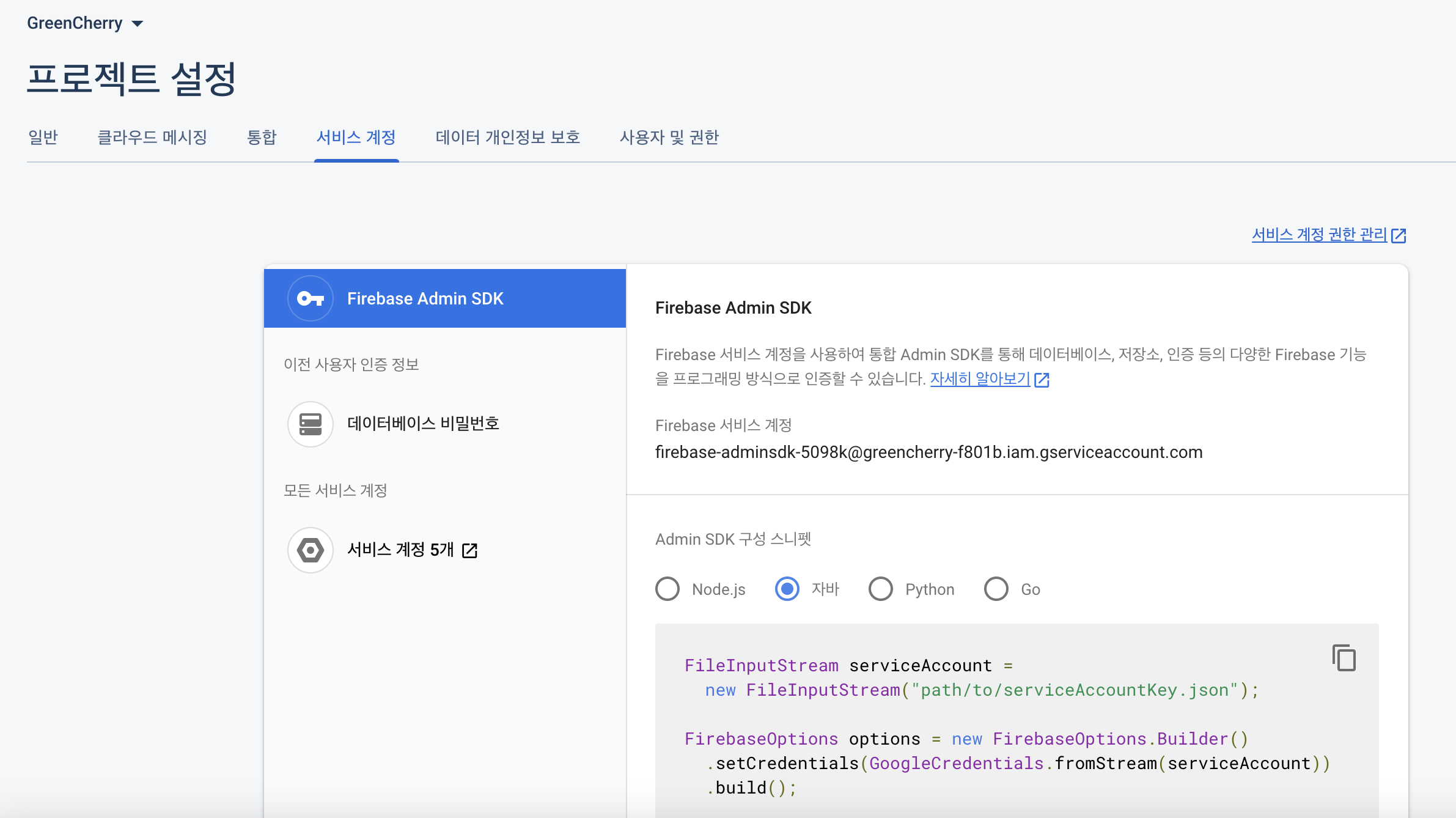 생성한 프로젝트 페이지 > 설정 > 서비스 계정 항목